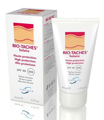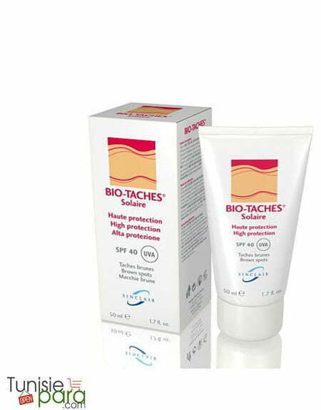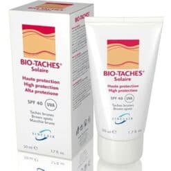 BIO-TACHES SOLAIRE TEINTÉ HAUTE PROTECTION SPF50 est un écran solaire teinté formulé grâce à la combinaison de filtres et d’écrans minéraux qui assurent à la peau une très haute protection contre les rayons nocifs UVA et les UVB. La présence de « Biotanoïde » prévient la formation de taches brunes, et régule la mélanogénèse ce qui permet la constitution d’un hâle uniforme. Riche en agents hydratants et en Vitamine E il lutte lutte contre le dessèchement et le vieillissement cutanés.