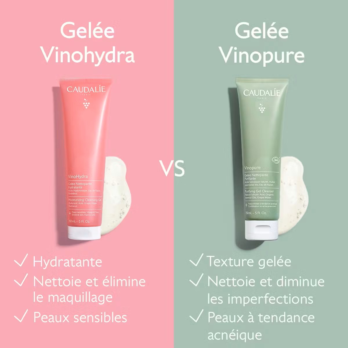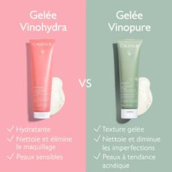 | La Gelée Nettoyante Purifiante Vinopure est un nettoyant destiné aux peaux mixtes à tendance acnéique, tandis que la Gelée Nettoyante Hydratante VinoHydra est à la fois démaquillante et nettoyante, idéale pour les peaux déshydratées et sensibles. | |