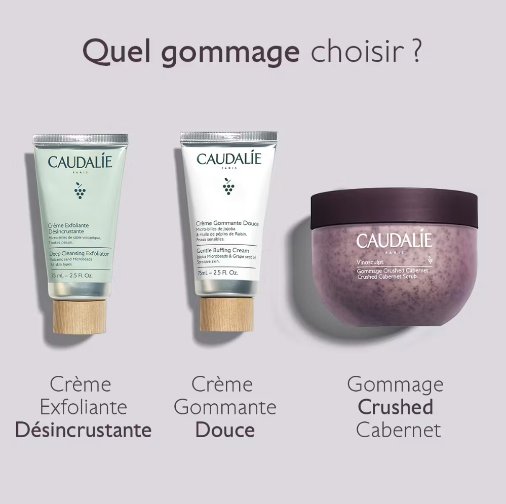 | Le saviez-vous ? | Le Gommage Crushed Cabernet Vinosculpt est le soin exfoliant du Programme Fermeté Caudalie. Cette routine en 4 étapes comprend le Gommage Crushed Cabernet, le Baume Corps Lift & Fermeté, le Concentré Minceur et les Tisanes Bio Drainantes. Résultat ? Une taille de pantalon en moins dès 28 jours*.