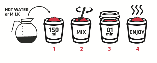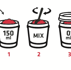 - Versez directement dans le pot 150ml à 200ml d’eau chaude ou de lait chaud. Faites varier la quantité de liquide pour obtenir la consistance épaisse ou lisse désirée.