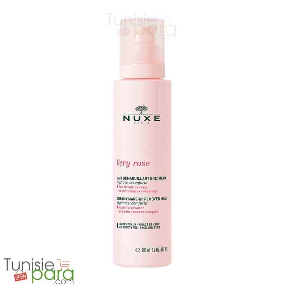 Nuxe Very Rose Lait Démaquillant Ce lait onctueux au doux parfum de rose démaquille parfaitement, hydrate et réconforte la peau du visage et des yeux,