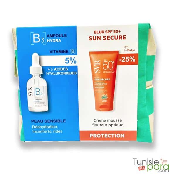 La trousse SVR associe deux soins essentiels pour les peaux sensibles et déshydratées : l’Ampoule B3 Hydra pour une hydratation intense et anti-rides, et Sun Secure Blur SPF50+ pour une protection solaire haute performance tout en sublimant le teint.